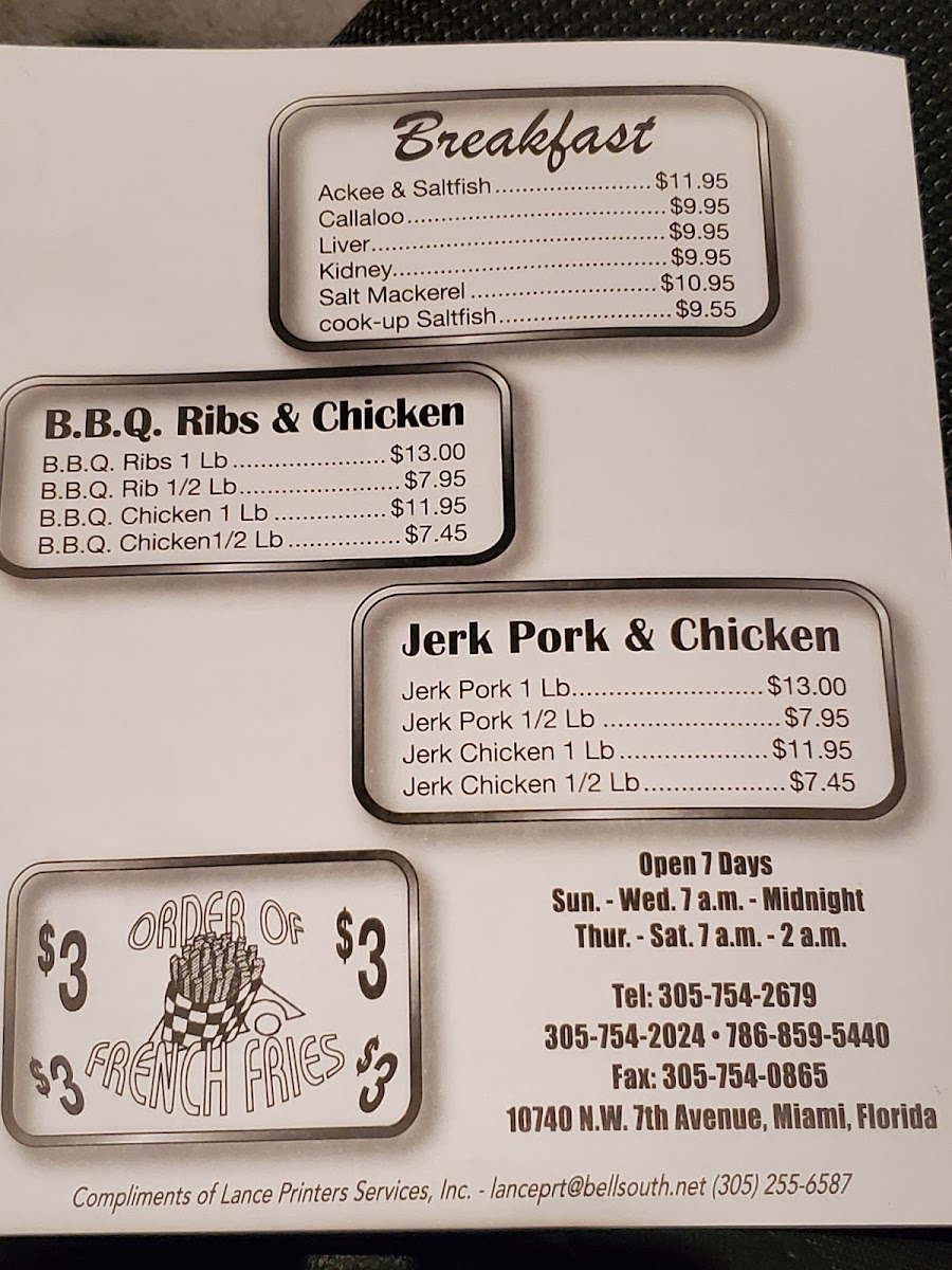 Alongside main dishes, the menu includes traditional breakfast choices such as ackee and saltfish, as well as lighter accompaniments like various sodas, fresh fruit punches, and refreshing house-made drinks. These beverages complement the bold spices and robust flavors found throughout the menu, helping balance the meal and enhance the overall experience.